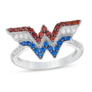 Garnet, Blue Sapphire and 1/15 CT. T.W. Diamond Symbol Ring in Sterling Silver