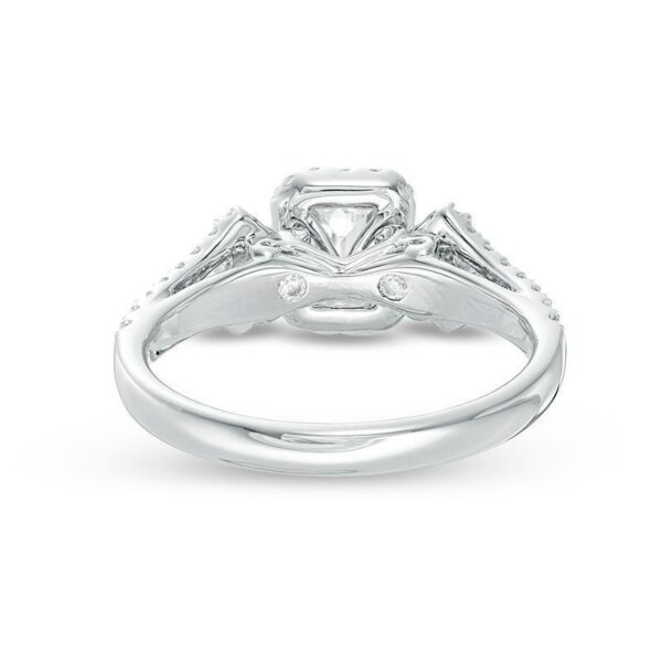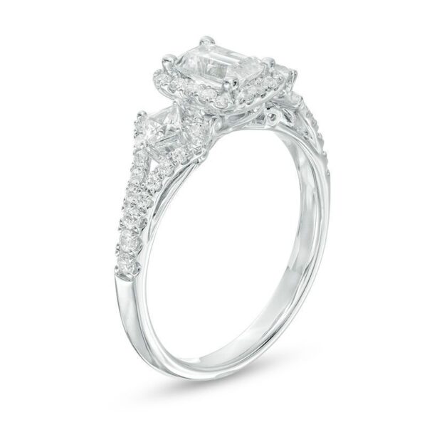 honor her with the sparkling look of this diamond engagement ring. Crafted in 14K white gold, this elegant choice features a 1/2 ct. certified emerald-cut diamond flanked by 1/10 ct. princess-cut diamonds – all boasting a color rank of I and clarity of I1. Smaller diamonds decorate the design. and set with two accent diamonds, a beautiful reminder of your promise to always be by her side. Radiant with 1 ct. t.w. of diamonds and a brilliant buffed luster, this engagement ring is a beautiful reminder of your love. This style arrives with a certificate that includes a photo and description of the diamond, which guarantees quality and can be used for insurance purposes.