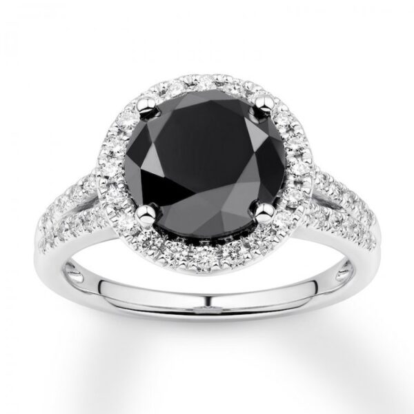 A beautiful, round 4-carat black diamond encircled by sparkling white diamonds forms the center of this contemporary engagement ring. Additional white diamonds line the 14K white gold split-shank band, bringing the total diamond weight to 4 1/3 carats. Black diamonds are treated to permanently create the intense black color.