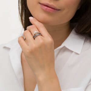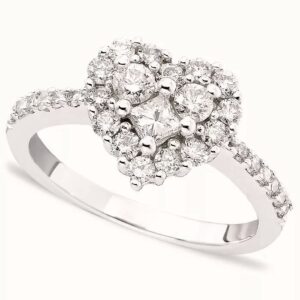 A gorgeous symbol of your love, this sparkling bridal; features an engagement ring with a romantic heart-shaped diamond haloed by glimmering round diamonds. The band and matching wedding ring are adorned with twists of round diamonds, bringing the total weight of the set to 7/8 carat. The ring is styled in 14K white gold.