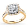 Framed by two rows of round diamonds, four princess-cut diamonds sparkle together in this beautiful engagement ring. The 14K yellow gold band glitters with channel-set round diamonds, bringing the total diamond weight to 3/4 carat. The center diamonds are set in 14K white gold.