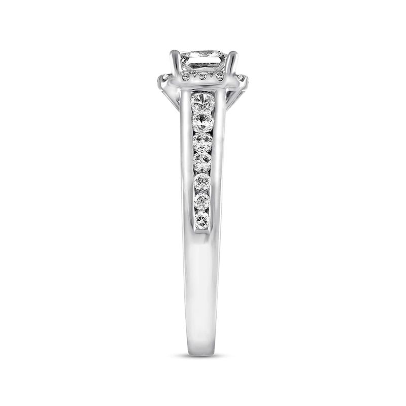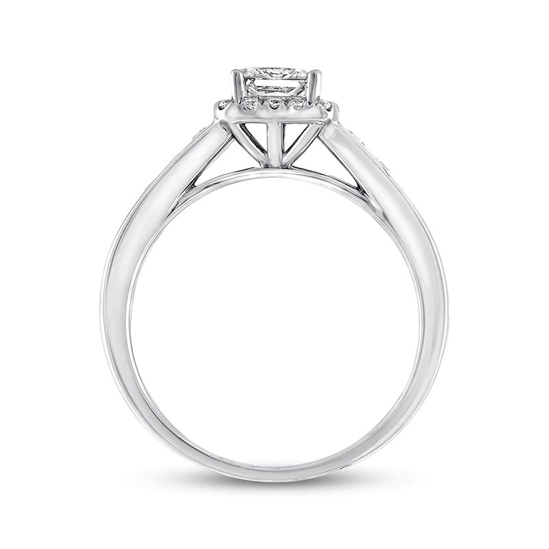 The center of this pretty engagement ring features a princess-cut diamond center resting in a glimmering frame of round diamonds. Additional round diamonds are in the 14K white gold band, bringing the total weight of the ring to 5/8 carat. From the Now & Forever? Bridal Collection.