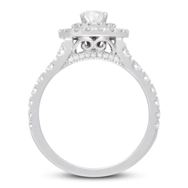 Collection comes this enchanting women’s engagement ring. The ring features a stunning pear-shaped diamond at its center, haloed by two rows of brilliant round diamonds. Additional round diamonds grace each side of the band, bringing the total diamond weight to 1 3/8 carats.The ring is fashioned in 14K white gold.