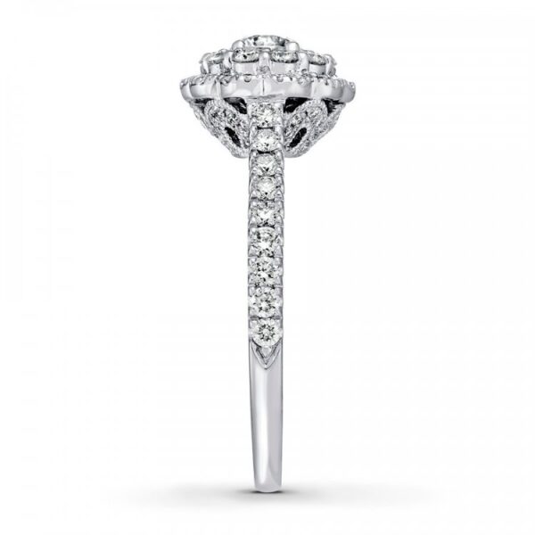 This breathtaking engagement ring? features a shimmering round diamond haloed by smaller round diamonds as the floral-inspired focal point. Additional diamonds grace the 14K white gold band, bringing the total diamond weight to 1 carat.