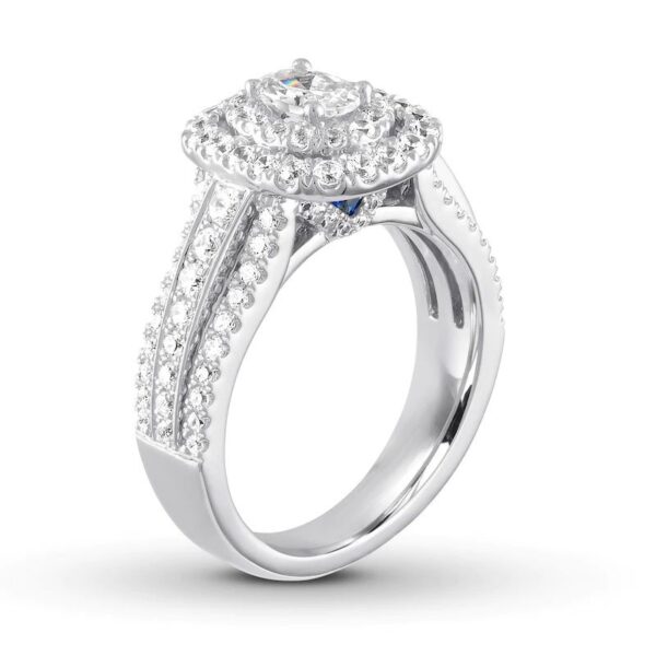Brilliant round diamonds sweep across the band and halo the dazzling 1/2-carat oval diamond center of this thrilling engagement ring. Princess-cut sapphires, the signature of the collection and a symbol of faithfulness and everlasting love, are set into the ring bezel. With a total diamond weight of 1 3/8 carats, the 14K white gold ring is a brilliant beginning to your romantic love story.