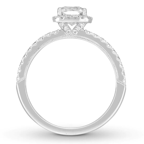 Boasting an impressive 2 carats in total diamond weight, this eye-catching diamond engagement ring is fahsioned in 10K white gold and features stunning round diamonds forming its pear-shaped center. Additional round diamonds halo the center and beam down the band with baguette diamonds in between.